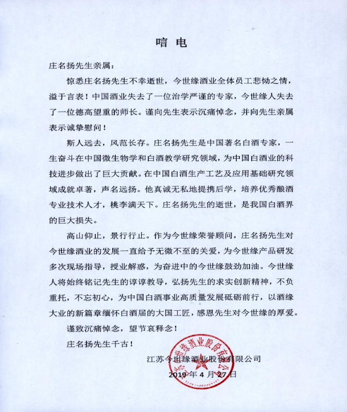 唁電還說(shuō),高山仰止,景行行止。作為今世緣榮譽(yù)顧問(wèn),莊名揚先生對今世緣酒業(yè)的發(fā)展一直給予無(wú)微不至的關(guān)愛(ài),為今世緣產(chǎn)品研發(fā)多次現場(chǎng)指導,授業(yè)解惑,為奮進(jìn)中的今世緣鼓勁加油。今世緣人將始終銘記先生的諄諄教導,弘揚先生的求實(shí)創(chuàng )新精神,不負重托,不忘初心,為中國白酒業(yè)高質(zhì)量發(fā)展砥礪前行,以酒緣大業(yè)的新篇章緬懷白酒屆的大國工匠,感恩先生對今世緣的厚愛(ài)。