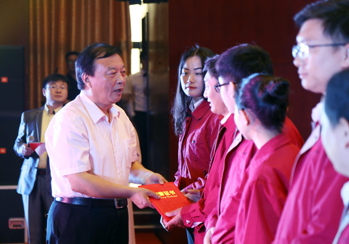 今世緣酒業(yè)黨委書(shū)記、董事長(cháng)、總經(jīng)理周素明為獲獎人員頒獎。