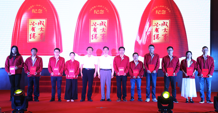 今世緣酒業(yè)黨委書(shū)記、董事長(cháng)、總經(jīng)理周素明,副總經(jīng)理、董事會(huì )秘書(shū)王衛東與獲獎人員合影。