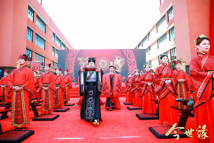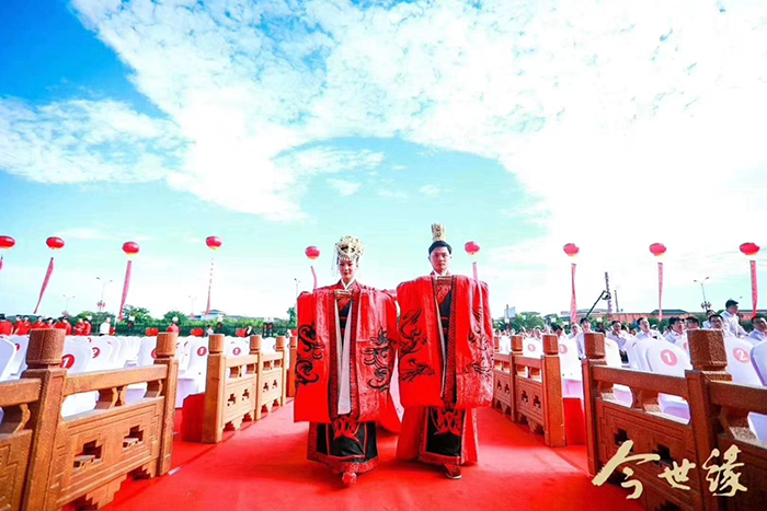 漢式婚禮以周禮為藍本,以典雅、尊貴、莊敬為氣韻,追本溯源,是真正體現華夏經(jīng)典文化傳統的民族婚禮。在華夏民族的傳統中,漢式婚禮被視為禮樂(lè )文明的根本所在,被視為人倫關(guān)系和社會(huì )秩序的起點(diǎn),被視為人與自然陰陽(yáng)相和諧而化生萬(wàn)物的本源。今世緣酒業(yè)在新中國70華誕之際,面向全國甄選70對新人,用中華民族古老、恢弘的漢式禮儀為新人成婚,完美詮釋了“家國同慶,緣結天下”的活動(dòng)內涵。