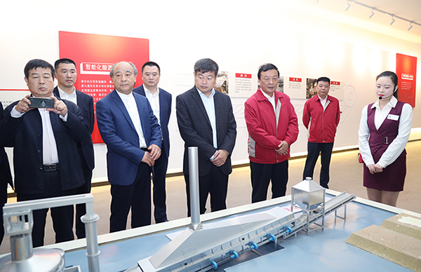 鄭超(中)、梁金輝(左二)一行在公司黨委書(shū)記、董事長(cháng)、總經(jīng)理周素明,黨委副書(shū)記、工會(huì )主席、監事會(huì )主席魯正波的陪同下參觀(guān)中國白酒智能化釀造示范車(chē)間。