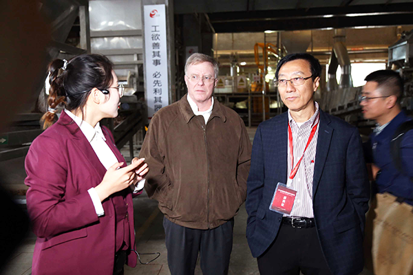 美國俄勒岡州立大學(xué)Michael Qian教授(右二)、美國伊利諾伊大學(xué)食品化學(xué)專(zhuān)家Keith Cadwallader教授(左二)參觀(guān)今世緣酒業(yè)智能化示范車(chē)間。