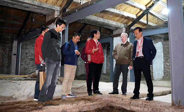 美國俄勒岡州立大學(xué)Michael Qian教授(右一)、美國伊利諾伊大學(xué)食品化學(xué)專(zhuān)家Keith Cadwallader教授(右二)參觀(guān)今世緣酒業(yè)老窖池。