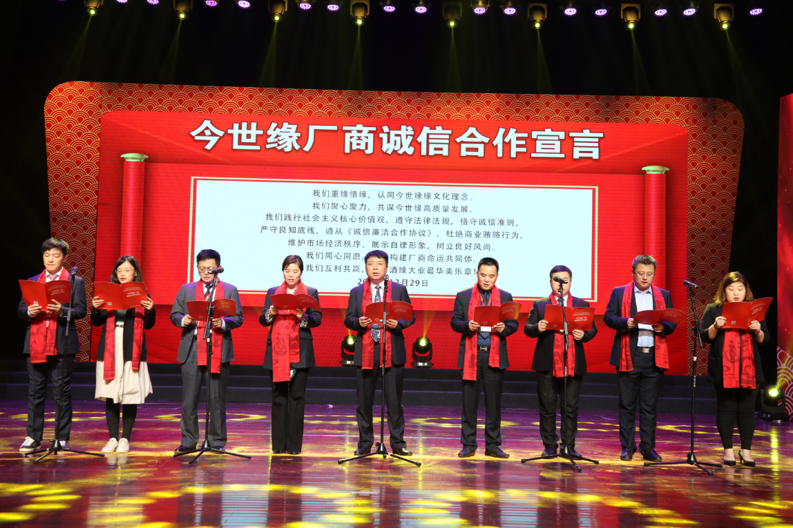“我們重緣惜緣,認同今世緣緣文化理念。我們聚心聚力,共謀今世緣高質(zhì)量發(fā)展?!苯袷谰壘茦I(yè)黨委副書(shū)記、監事會(huì )主席魯正波與8家今世緣合作方代表,共同宣讀了《今世緣廠(chǎng)商誠信合作宣言》,體現了營(yíng)造風(fēng)清氣正的廠(chǎng)商合作關(guān)系,呼喚誠信,擁抱誠信,促進(jìn)高質(zhì)量發(fā)展的決心。
