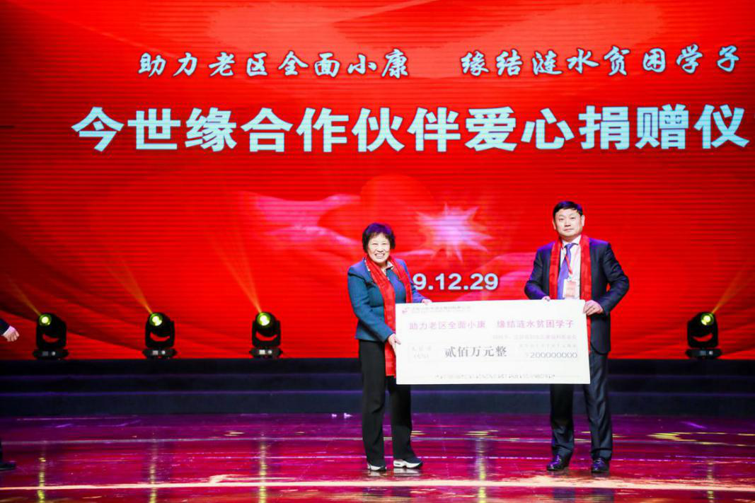 頒獎盛典現場(chǎng),舉行了“助力老區全面小康、緣結漣水貧困學(xué)子”愛(ài)心行動(dòng)捐資儀式。在2020今世緣發(fā)展大會(huì )期間,參會(huì )合作伙伴倡議為漣水圓夢(mèng)小康做點(diǎn)實(shí)實(shí)在在的事情,助力老區全面小康、緣結漣水貧困學(xué)子。今世緣酒業(yè)為此提供國緣特制愛(ài)心產(chǎn)品,以認購1瓶捐贈200元的方式,籌集200萬(wàn)元善款,通過(guò)江蘇省婦兒福利基金會(huì )定向資助漣水低收入家庭貧困學(xué)生。南京順溜商貿有限公司總經(jīng)理羅永勝代表今世緣合作伙伴向江蘇省婦兒福利基金會(huì )捐贈。江蘇省婦兒福利基金會(huì )副理事長(cháng)陳秀云肯定了今世緣酒業(yè)發(fā)揮國有企業(yè)在助力全面小康中的引領(lǐng)示范作用,帶動(dòng)利益相關(guān)方心懷國家,情系百姓,善于為善,善行助緣,在感恩社會(huì )、回報社會(huì )的實(shí)踐中守初心、擔使命,廠(chǎng)商攜手踐行 “釀美酒、結善緣”的義舉??h委常委、組織部部長(cháng)胡春雷,今世緣副董事長(cháng)、副總經(jīng)理吳建峰,副縣長(cháng)李闊,縣教育體育局局長(cháng)李長(cháng)春,縣婦聯(lián)主席王娟現場(chǎng)見(jiàn)證。