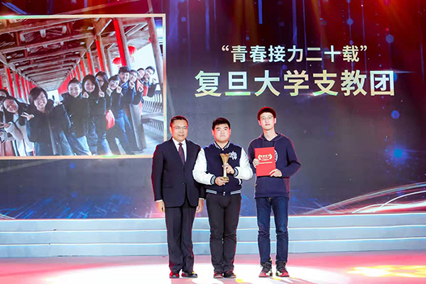 公司黨委副書(shū)記、副總經(jīng)理倪從春為“青春接力二十載”的復旦大學(xué)支教團頒獎。