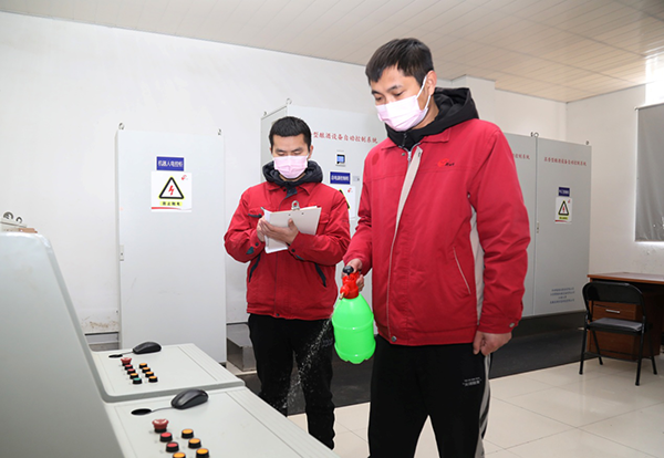今世緣酒業(yè)智能化釀酒車(chē)間員工在為設備控制室消毒。