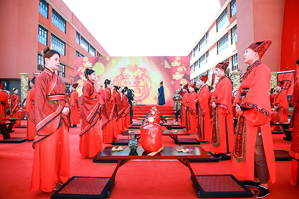 儀式當天,70 對新人身著(zhù)漢服緩緩入場(chǎng),行六禮之制,享婚典之儀,飲愛(ài)情之酒,再現了中華民族傳統婚典文化的古韻之美,還原了一場(chǎng)原汁原味的傳統漢式婚禮。來(lái)自全國各地的 70 對新人,在萬(wàn)眾矚目的漢式集體婚禮上喜結良緣,傳承優(yōu)秀傳統文化,傳播美好情緣,傳遞積極婚戀觀(guān),以最喜慶熱烈的方式,向新中國成立 70 周年致敬獻禮。