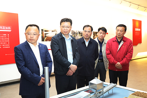 瀘州市委常委、副市長(cháng)劉春(左二)一行在中國白酒智能化釀造示范車(chē)間參觀(guān)。
