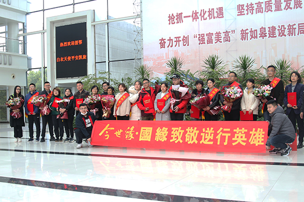 勇士逆行時(shí),朔風(fēng)凜冽寒未盡;英雄歸來(lái)日,春華正濃花滿(mǎn)枝。4月11日,在如皋市委、市政府舉行的迎接11名援鄂醫療隊員回如返崗歡迎儀式上,今世緣酒業(yè)蘇中大區如皋辦事處為英雄們送上了特制的國緣V9,表達對英雄的敬意和祝福。