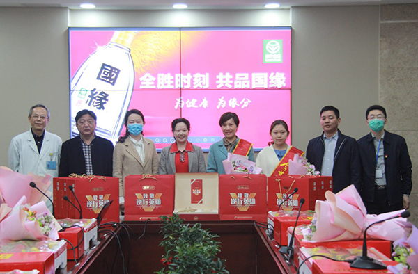 4月17日,鹽城大區向鹽城市婦幼保健院援鄂歸來(lái)的的白衣天使們送上鮮花和今世緣酒業(yè)特別定制美酒國緣V9,致敬逆行英雄。