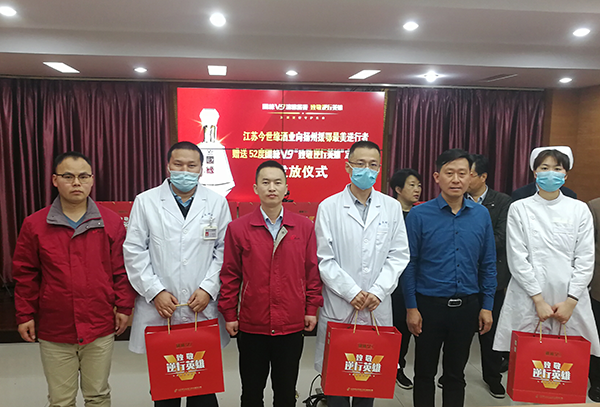 4月2日,泰州辦事處聯(lián)合泰州電視臺開(kāi)展公益活動(dòng),慰問(wèn)泰州援鄂醫療隊隊員、社區卡口一線(xiàn)防控人員代表,為他們送上特制的國緣V9。泰州市共派出5批援湖北醫療隊,共62名隊員。泰州援鄂醫療隊對今世緣的關(guān)心表示感謝,祝愿今世緣酒業(yè)越來(lái)越好。