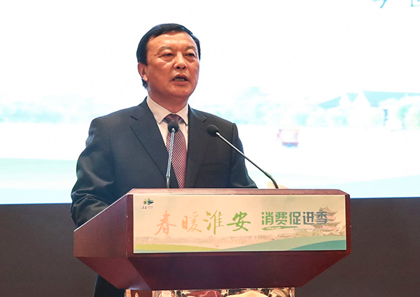在“春暖淮安·消費促進(jìn)季”主題活動(dòng)啟動(dòng)儀式上,今世緣酒業(yè)黨委書(shū)記、董事長(cháng)、總經(jīng)理周素明介紹企業(yè)促進(jìn)消費舉措。