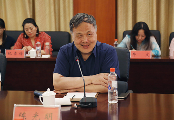 中國新聞社江蘇分社社長(cháng)陳光明在交流會(huì )上講話(huà)。