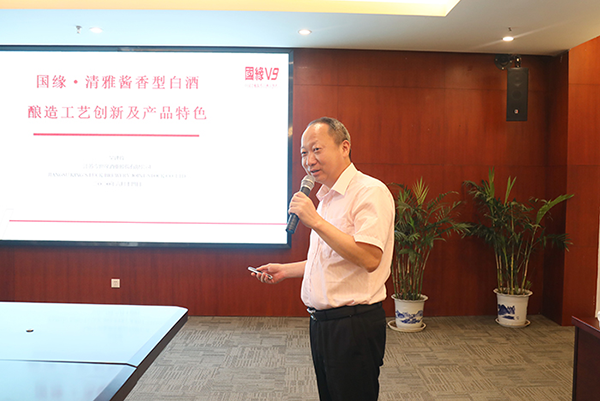 今世緣酒業(yè)副董事長(cháng)、副總經(jīng)理吳建峰介紹清雅醬香型白酒釀造工藝創(chuàng )新及產(chǎn)品特色。
