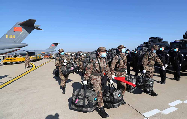 ↑一等獎作品:《空軍第四次向武漢大規??者\醫療隊隊員和物資》(組),周?chē)鴱姡ê保?/span>