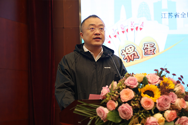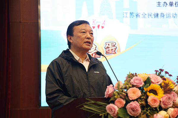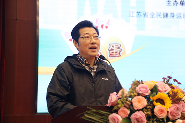 江蘇省摜蛋運動(dòng)協(xié)會(huì )會(huì )長(cháng)漆冠山在“國緣V9”江蘇省第八屆全民健身運動(dòng)會(huì )摜蛋項目比賽開(kāi)幕式上致辭