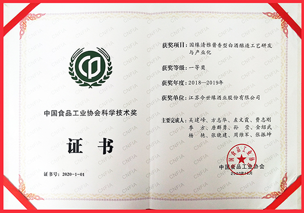 12月6日,2020中國食品工業(yè)協(xié)會(huì )科學(xué)技術(shù)獎勵大會(huì )在河南鄭州舉行,大會(huì )由中國食品工業(yè)協(xié)會(huì )主辦,每?jì)赡暝u審、授獎一次?!皣壡逖裴u香型白酒釀造工藝研發(fā)與產(chǎn)業(yè)化”項目獲得2020中國食品工業(yè)協(xié)會(huì )科學(xué)技術(shù)獎一等獎,今世緣酒業(yè)副董事長(cháng)、副總經(jīng)理吳建峰榮獲“全國食品工業(yè)科技創(chuàng )新領(lǐng)軍人物”稱(chēng)號。
