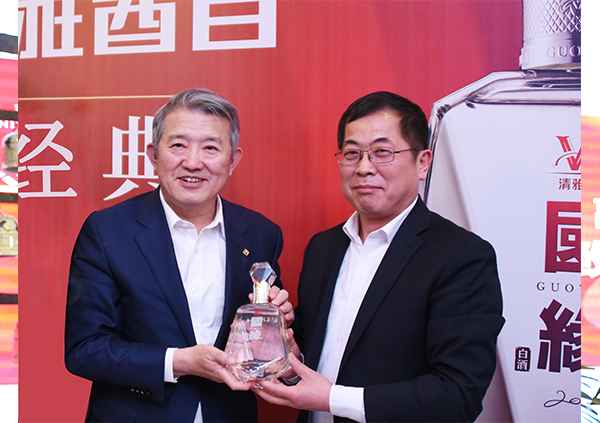 今世緣酒業(yè)黨委副書(shū)記、副董事長(cháng)、總經(jīng)理顧祥悅(右)向武漢大學(xué)杰出校友、泰康保險集團董事長(cháng)陳東升(左)贈送國緣V9定制酒。