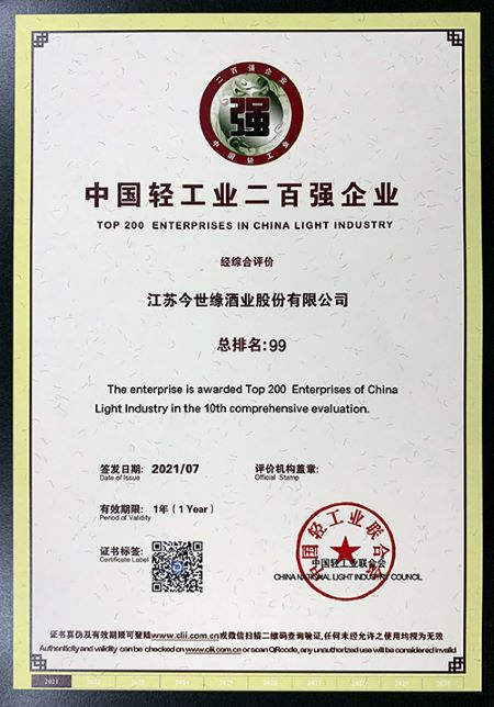 7月20日,由中國輕工業(yè)聯(lián)合會(huì )主辦、中國輕工業(yè)信息中心承辦的“奮進(jìn)十四五·領(lǐng)航新消費”中國輕工業(yè)百強企業(yè)高峰論壇在北京舉行。會(huì )上發(fā)布“中國輕工業(yè)二百強企業(yè)”等評選結果,今世緣酒業(yè)榮獲2020年度“中國輕工業(yè)二百強企業(yè)”“中國輕工業(yè)科技百強企業(yè)”“中國輕工業(yè)食品行業(yè)五十強企業(yè)”榮譽(yù)稱(chēng)號。