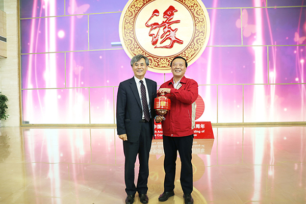 今世緣酒業(yè)黨委書(shū)記、董事長(cháng)周素明向韓國駐滬總領(lǐng)事金勝鎬(左一)贈送象征“緣聚”的“國緣100”定制紀念酒。