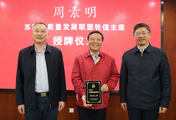 江蘇省商務(wù)廳副廳長(cháng)倪海清(右)與江蘇省工信廳二級巡視員常如平(左)為今世緣酒業(yè)黨委書(shū)記、董事長(cháng)周素明頒發(fā)蘇酒高質(zhì)量發(fā)展聯(lián)盟輪值主席牌匾。