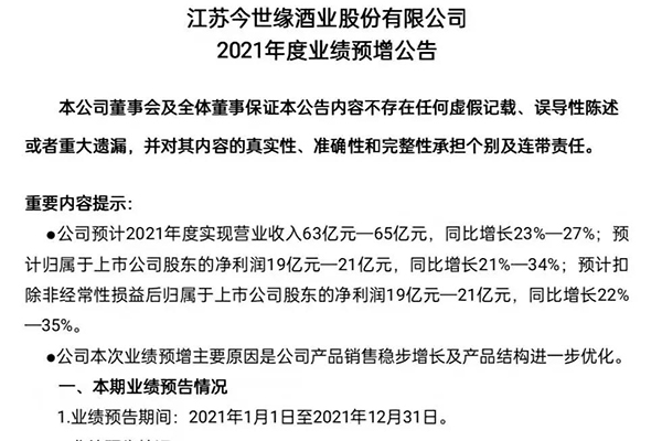 1月10日,今世緣酒業(yè)發(fā)布2021年度業(yè)績(jì)預增公告。預計2021年度實(shí)現營(yíng)收63億元-65億元,同比增長(cháng)23%-27%;預計歸屬于上市公司股東的凈利潤19億元-21億元,同比增長(cháng)21%-34%;預計扣除非經(jīng)常性損益后歸屬于上市公司股東的凈利潤19億元-21億元,同比增長(cháng)22%-35%。