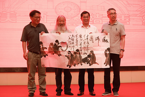 著(zhù)名畫(huà)家徐培晨(左二)向今世緣贈送作品。 蔣更初 攝