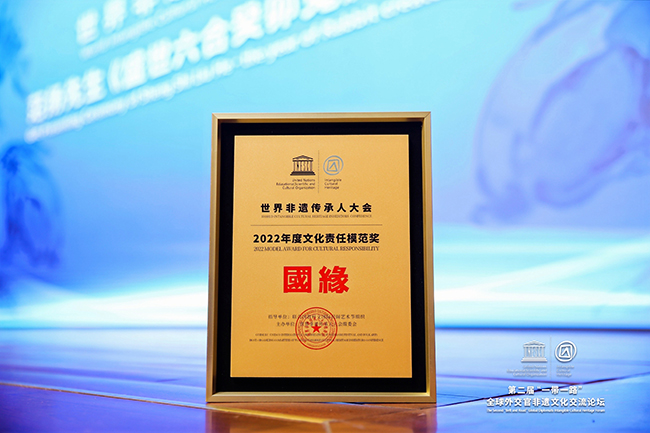 1月6日,以“六合共生,盛世國緣”為主題的第二屆“一帶一路”全球外交官非遺文化交流論壇在北京召開(kāi)。論壇期間,國緣品牌榮獲“2022年度文化責任模范獎”。